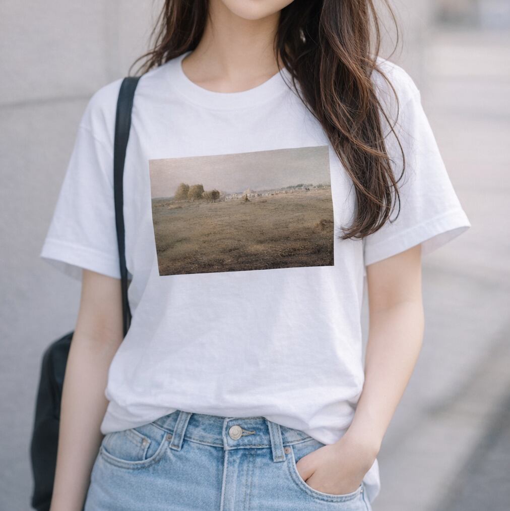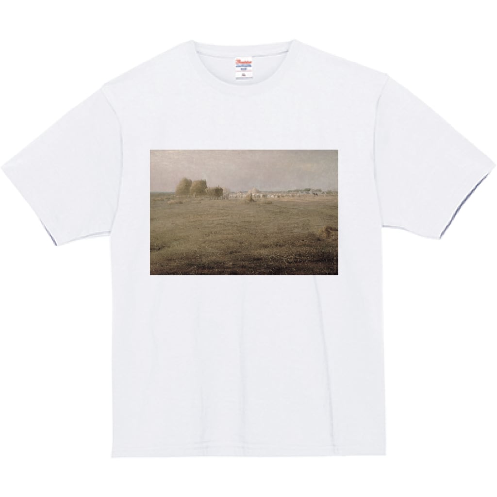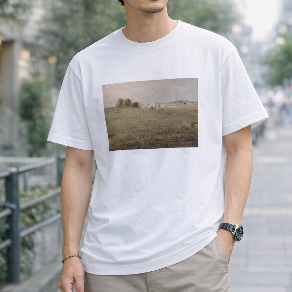 フランスの画家ジャン=フランソワ・ミレーによって描かれた誰もが一度は目にしたことのある名画「落穂拾い」(おちぼひろい)をモチーフにしたアートなTシャツです。
