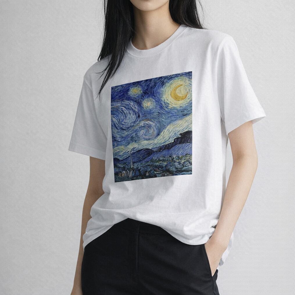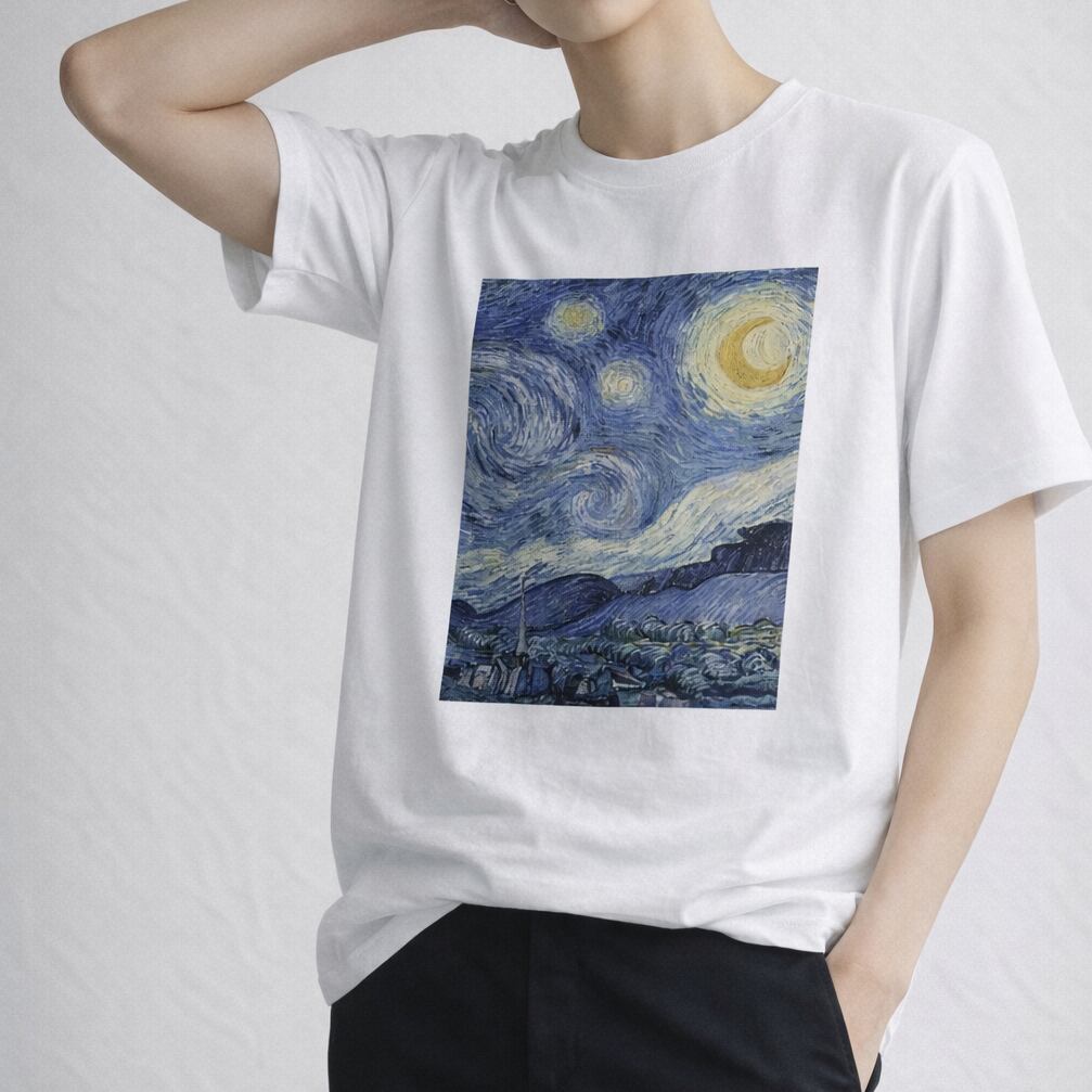 フィンセント・ファン・ゴッホの代表作の一つである「星月夜」(ほしづきよ)をモチーフにしたアートなTシャツです。