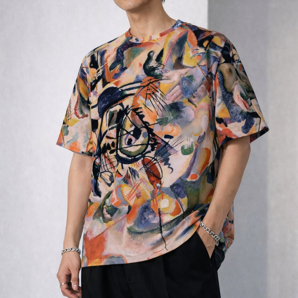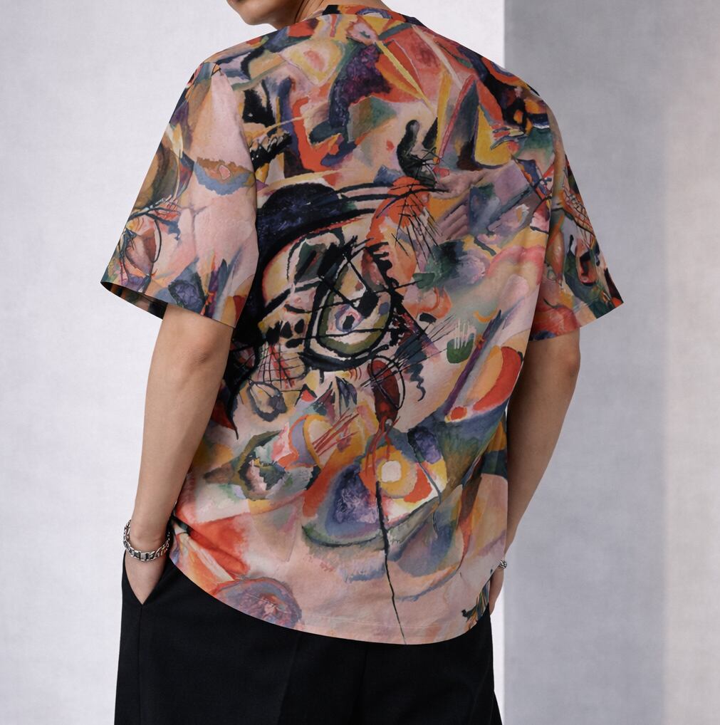 カンディンスキー「Composition VII」をモチーフに大胆にデザインされた総柄シャツです。